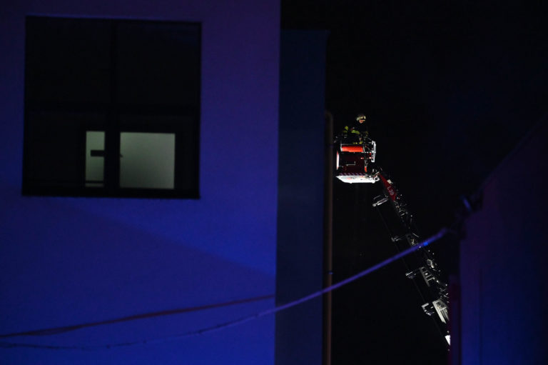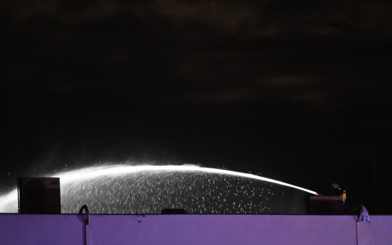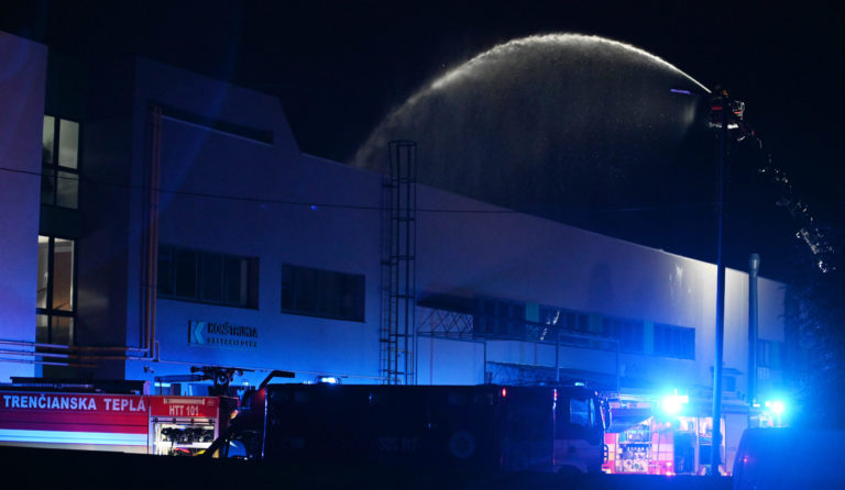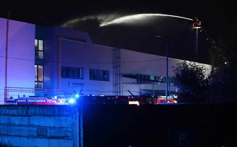 Hasiči striekajú penu na strechu výrobnej haly súkromnej spoločnosti na ulici K výstavisku v Trenčíne, kde vypukol v nedeľu večer požiar strechy galvanizovne. Trenčín, 1. október 2023. Foto: SITA/Tomáš Somr