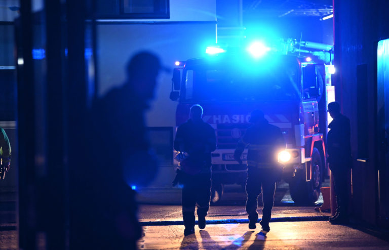 Hasiči v priestoroch súkromnej spoločnosti na ulici K výstavisku v Trenčíne, kde vypukol v nedeľu večer požiar strechy galvanizovne. Na likvidáciu požiaru vyslali 12 kusov techniky a 22 hasičov. Trenčín, 1. október 2023. Foto: SITA/Tomáš Somr