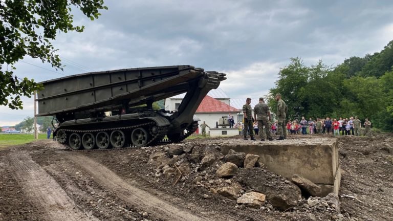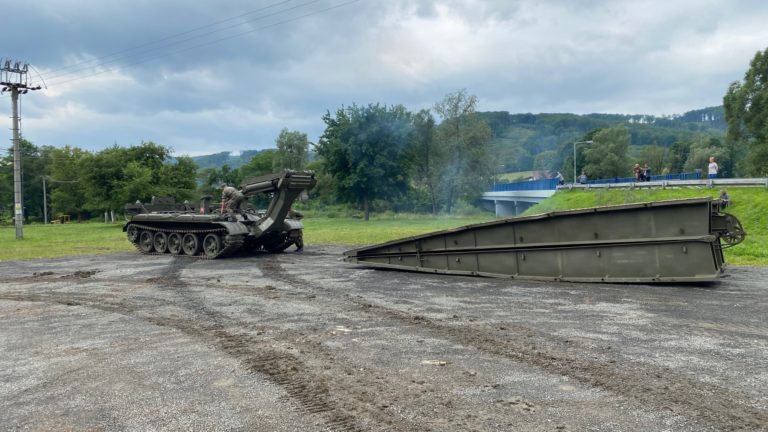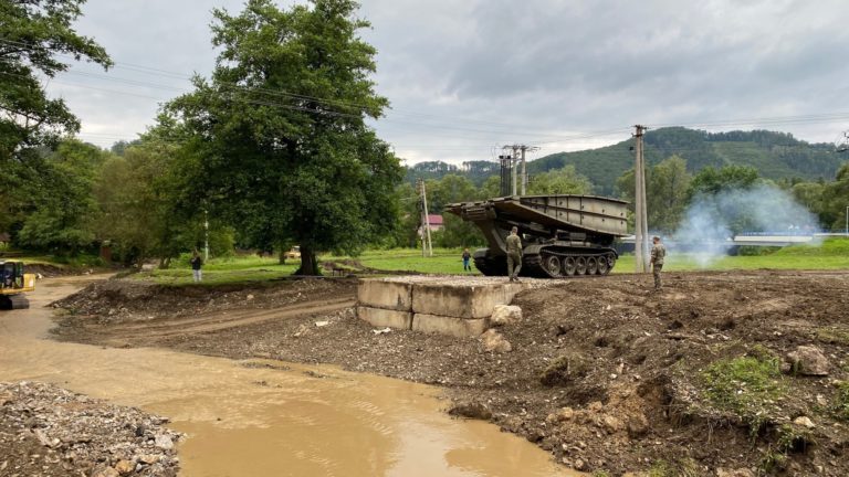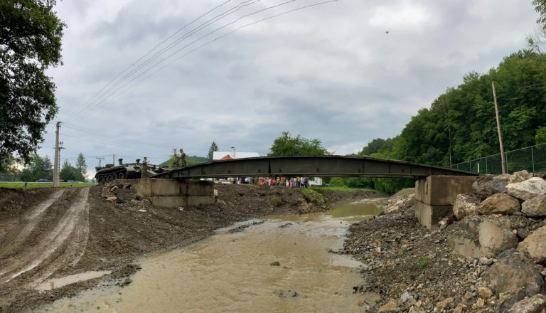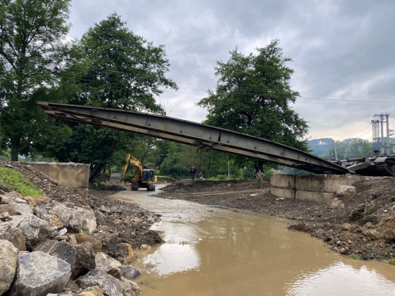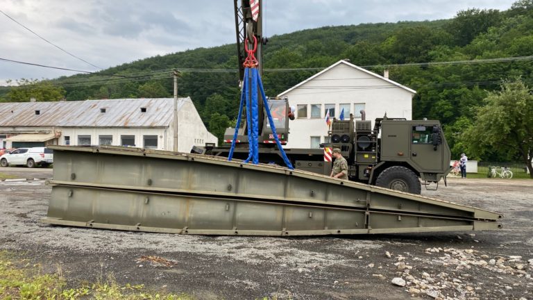 Príslušníci Ozbrojených síl SR dnes v obci Zubné v okrese Humenné zabezpečili náhradné premostenie, ktoré nahradí strhnutý most a opäť spojí časti obce. 27. jún 2020 Foto: www.facebook.com