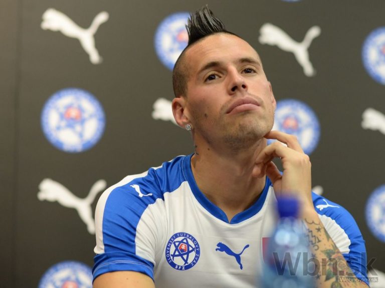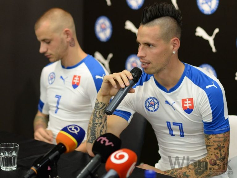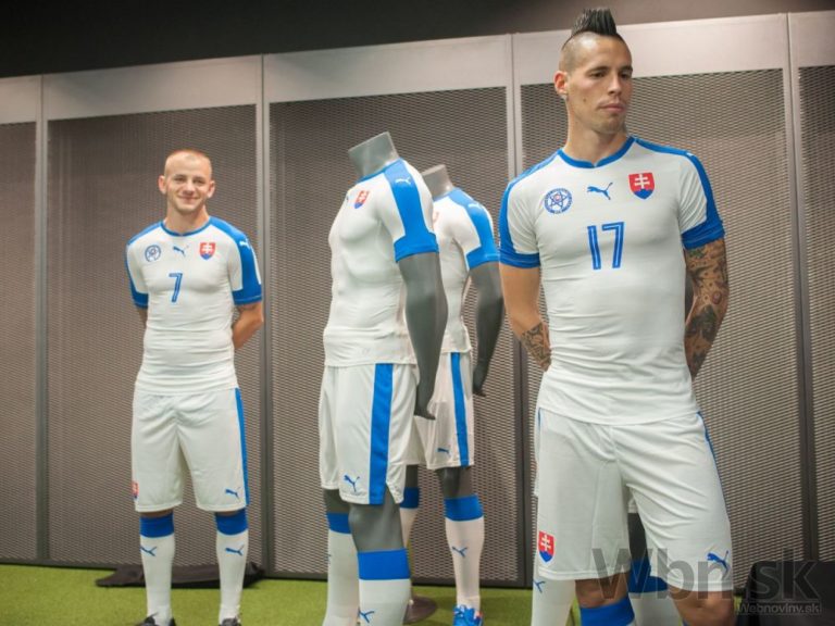 Slovenský futbalový zväz (SFZ) predstavil v pondelok nové dresy A-tímu SR s moderným dizajnom. Zverenci trénera Jána Kozáka v nich budú hrať na ME 2016 vo Francúzsku, kam slovenská futbalová reprezentácia postúpila prvýkrát v histórii. Nové dresy v tradičných bielo-modrých farbách prezentovali kapitán národného tímu Marek Hamšík a Vladimír Weiss. Bratislava, 9. november 2015.