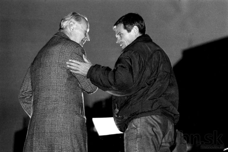 Zľava: Alexander Dubček a Milan Kňažko na tribúne počas zhromaždenia verejnosti v Bratislave počas novembrových dní roka 1989. Foto: Ján Lörincz/SITA