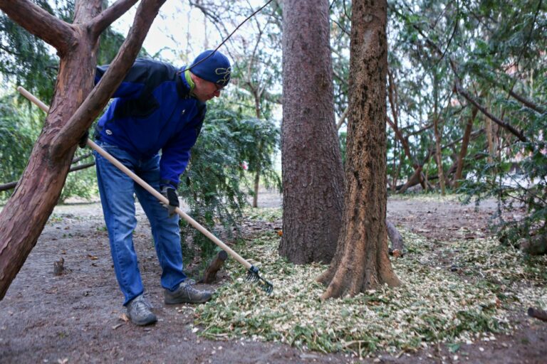 Dobrovoľník počas rozhrabávania mulču okolo stromov v rámci novoročného mulčovania vianočných stromčekov v Sade Janka Kráľa v Bratislave. Bratislava, 18. január 2025. Foto: SITA/Tomáš Susko