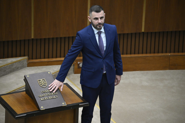Poslanec parlamentu za stranu Smer - SSD Michal Stuška skladá poslanecký sľub počas ustanovujúcej schôdze Národnej rady SR. Bratislava, 25. október 2023. Foto: SITA/Diana Černak.