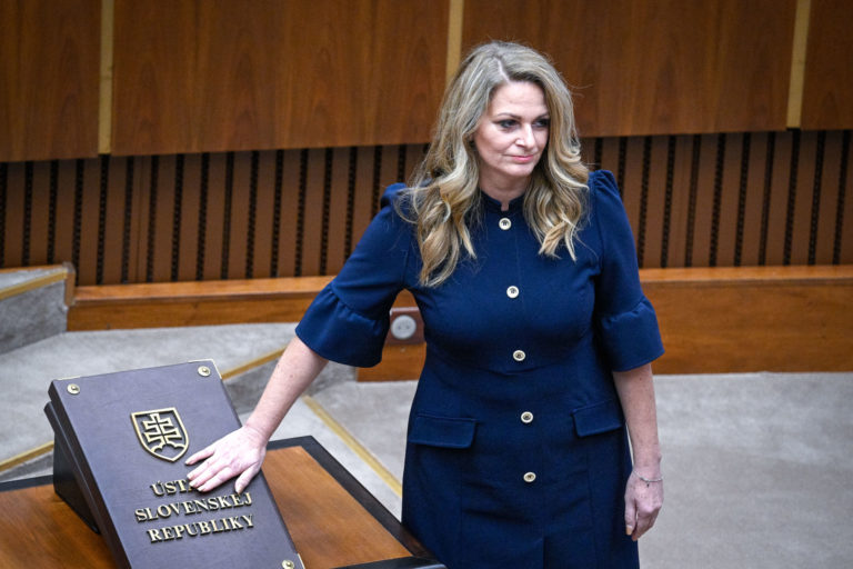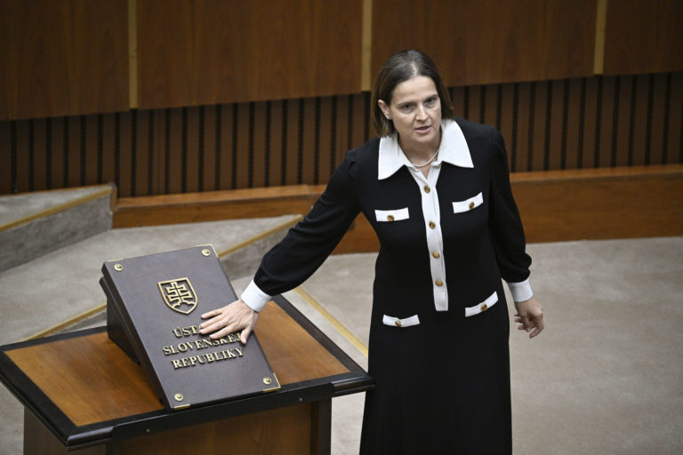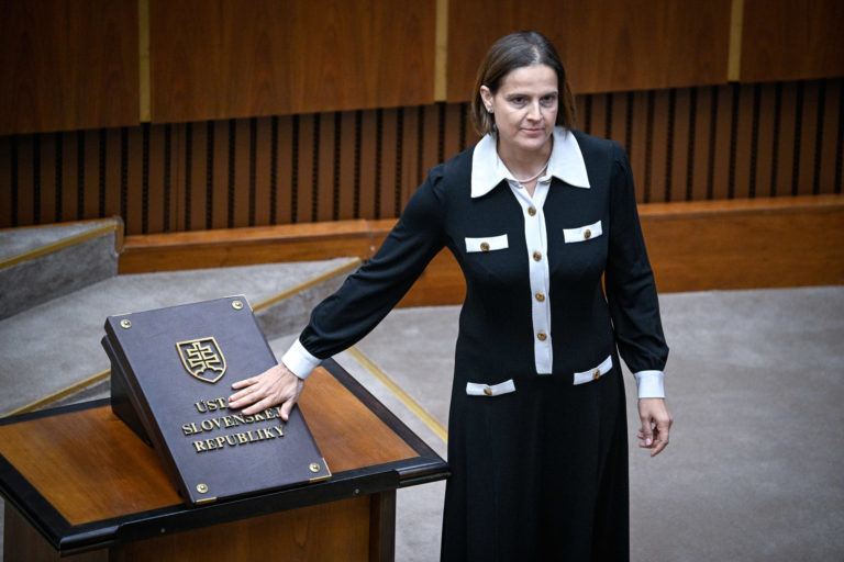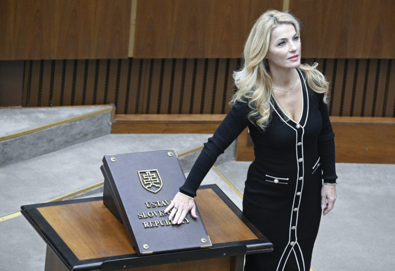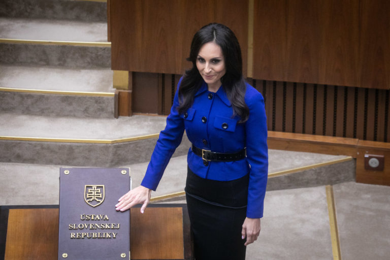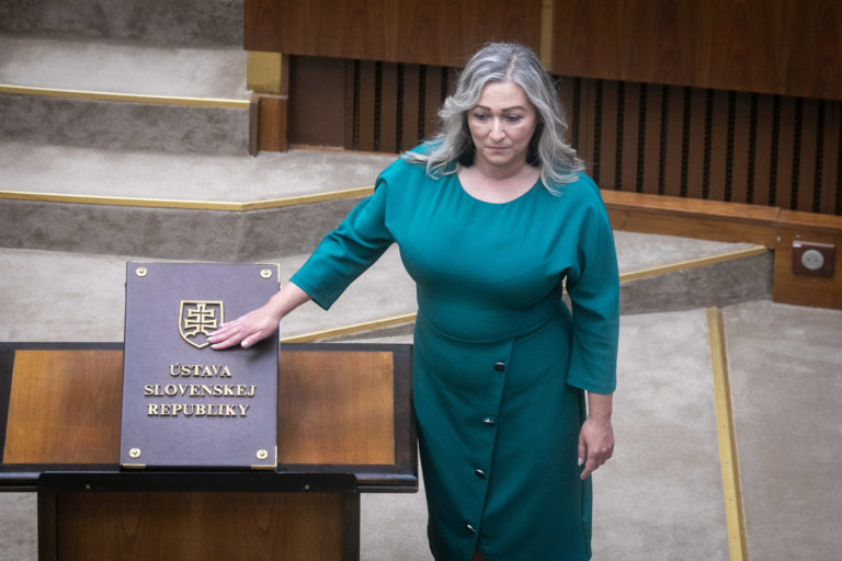 Novozvolená poslankyňa NR SR za Slovenskú národnú stranu (SNS) Martina Šimkovičová skladá poslanecký sľub počas ustanovujúcej schôdze Národnej rady SR. Bratislava, 25. október 2023. Foto: SITA/Milan Illík