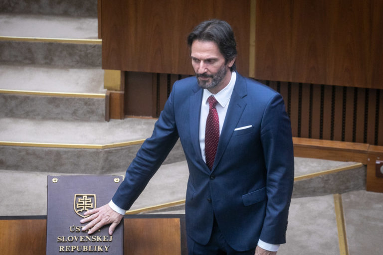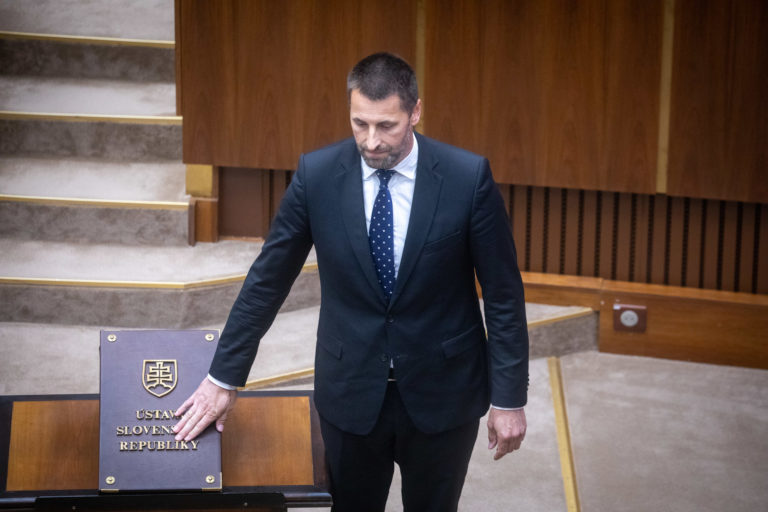 Poslanec parlamentu za stranu Sloboda a Solidarita (SaS) Branislav Gröhling skladá poslanecký sľub počas ustanovujúcej schôdze Národnej rady SR. Bratislava, 25. október 2023. Foto: SITA/Diana Černak.