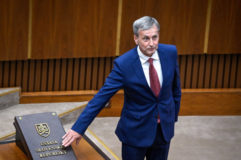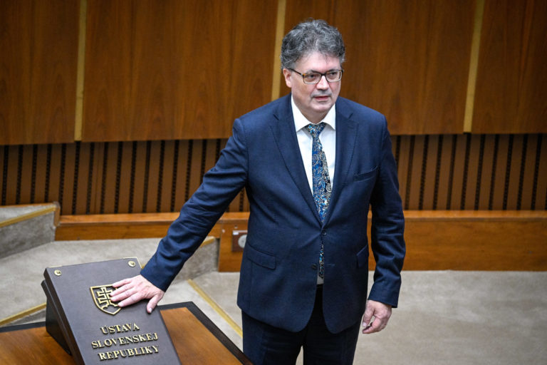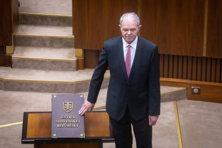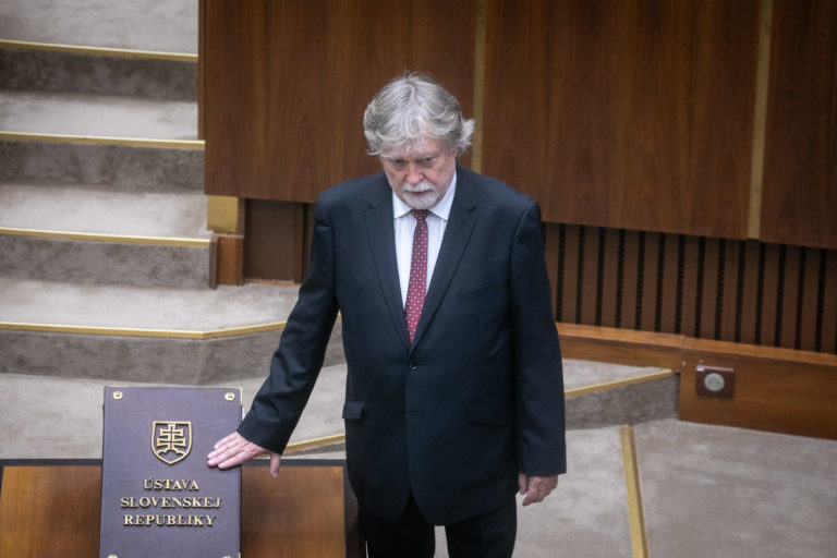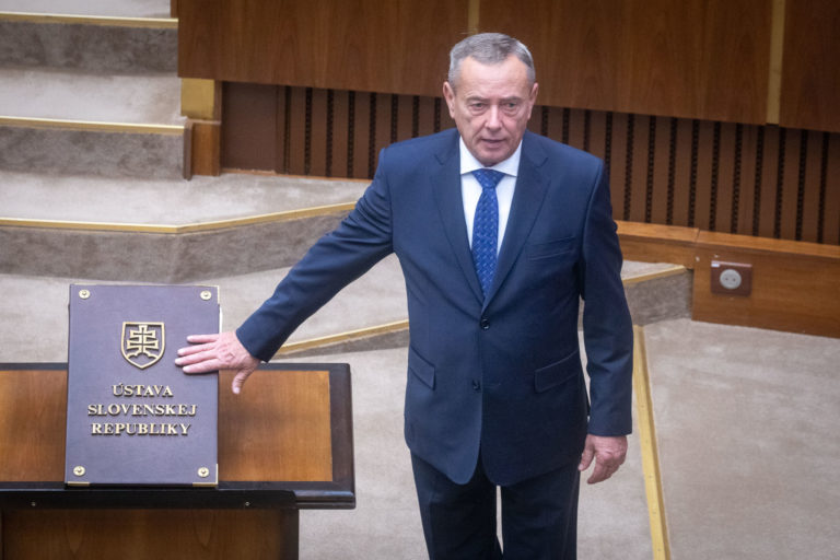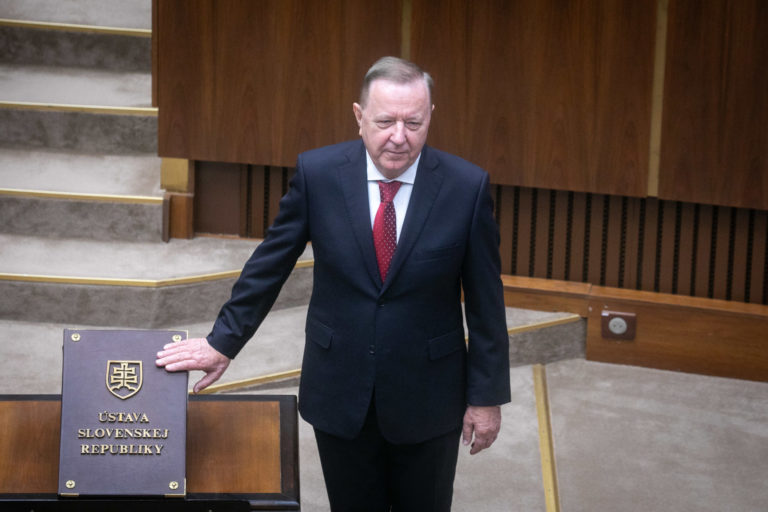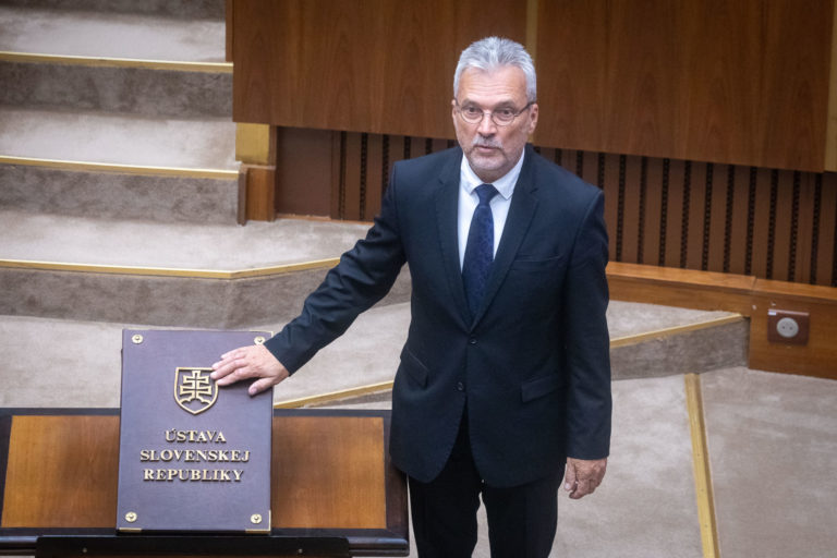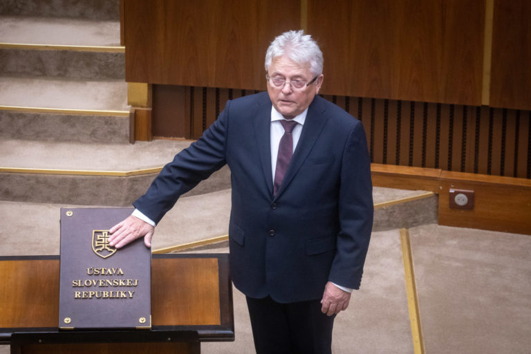 Poslanec parlamentu za Kresťanskodemokratické hnutie (KDH) František Mikloško skladá poslanecký sľub počas ustanovujúcej schôdze Národnej rady SR. Bratislava, 25. október 2023. Foto: SITA/Diana Černak