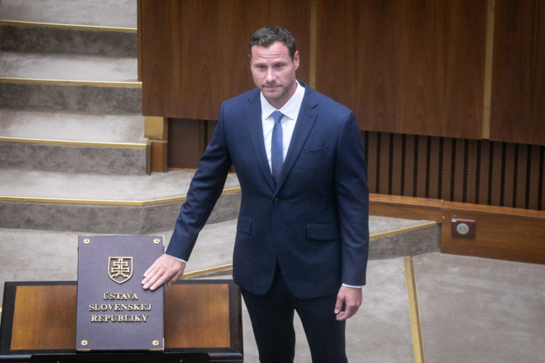 Poslanec parlamentu za hnutie Progresívne Slovensko (PS) Martin Pekár skladá poslanecký sľub počas ustanovujúcej schôdze Národnej rady SR. Foto: archívne, SITA/Diana Černak