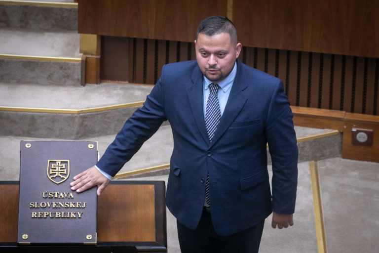 Poslanec parlamentu za stranu Smer - SSD Daniel Karas skladá poslanecký sľub počas ustanovujúcej schôdze Národnej rady SR. Bratislava, 25. október 2023. Foto: SITA/Diana Černak