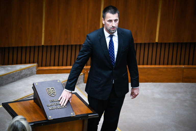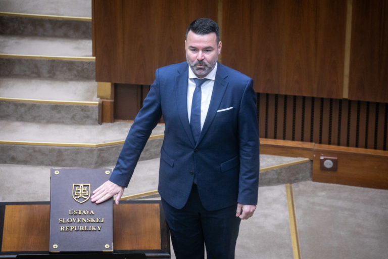 Poslanec parlamentu za hnutie OĽANO a priatelia Gábor Grendel skladá poslanecký sľub počas ustanovujúcej schôdze Národnej rady SR. Bratislava, 25. október 2023. Foto: SITA/Diana Černak