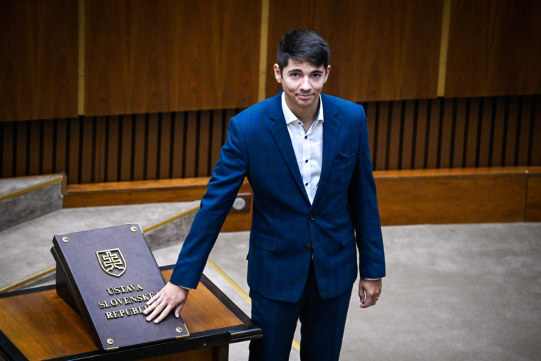 Poslanec parlamentu za hnutie Progresívne Slovensko (PS) Oskar Dvořák skladá poslanecký sľub počas ustanovujúcej schôdze Národnej rady SR. Bratislava, 25. október 2023. Foto: SITA/Diana Černak