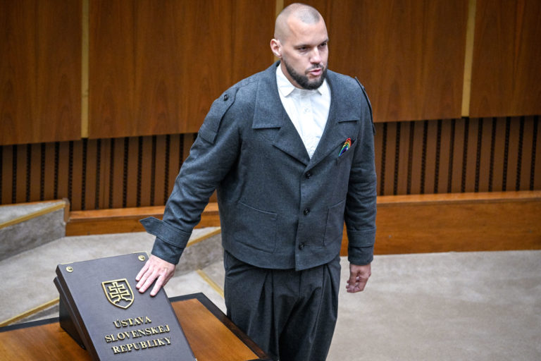 Poslanec parlamentu za hnutie Progresívne Slovensko (PS) Michal Sabo skladá poslanecký sľub počas ustanovujúcej schôdze Národnej rady SR. Bratislava, 25. október 2023. Foto: SITA/Diana Černak.