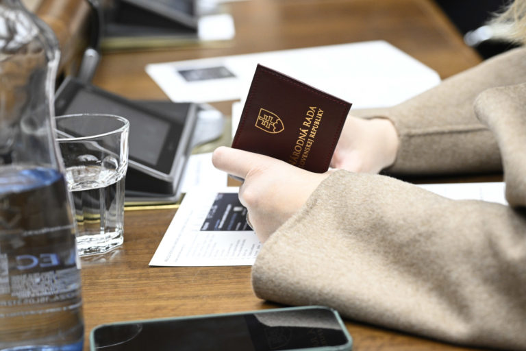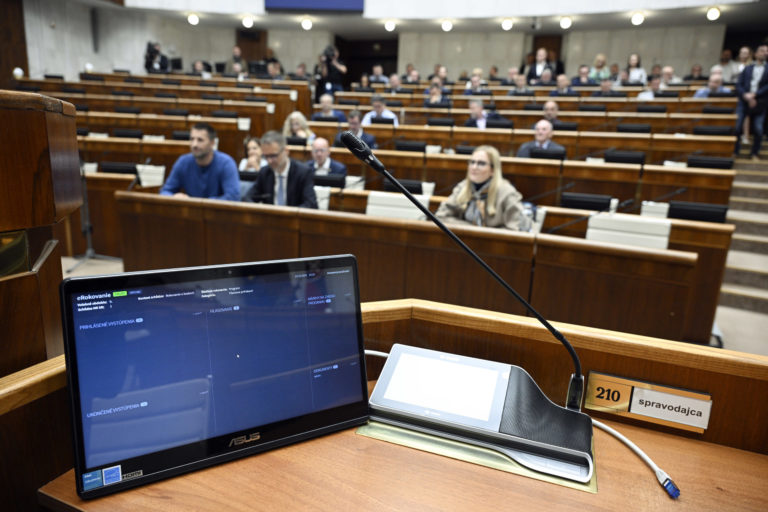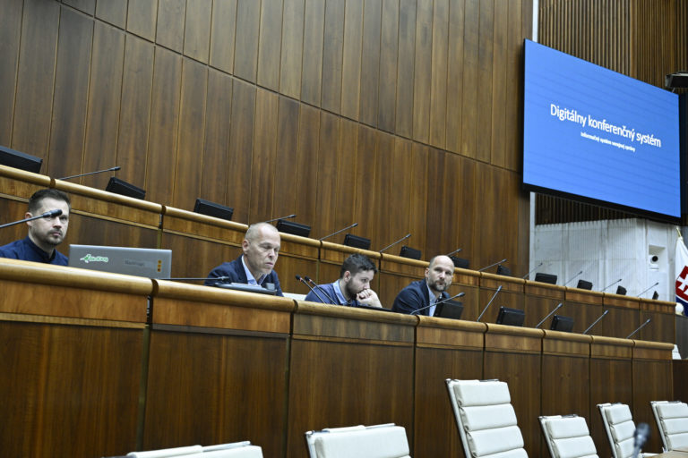 Digitálny konferenčný systém v rokovacej sále parlamentu počas skúšky digitálneho kongresového systému Národnej rady (NR) SR za účasti zvolených poslancov NR SR. Bratislava, 24. október 2023. Foto: SITA/Milan Illík