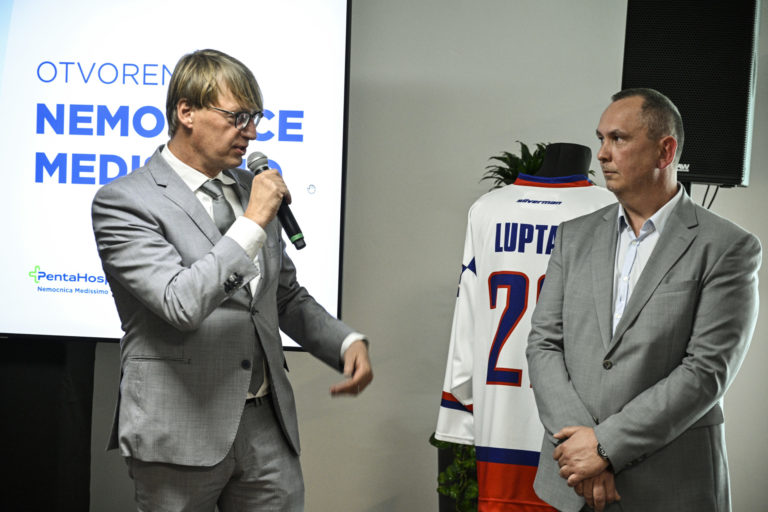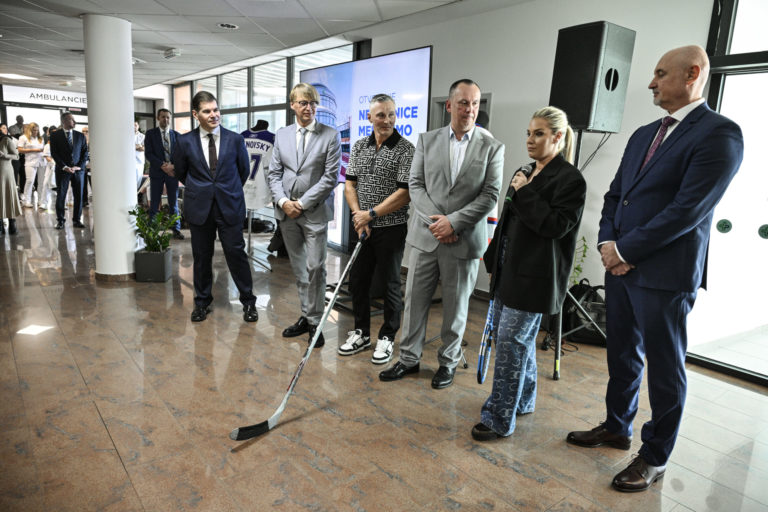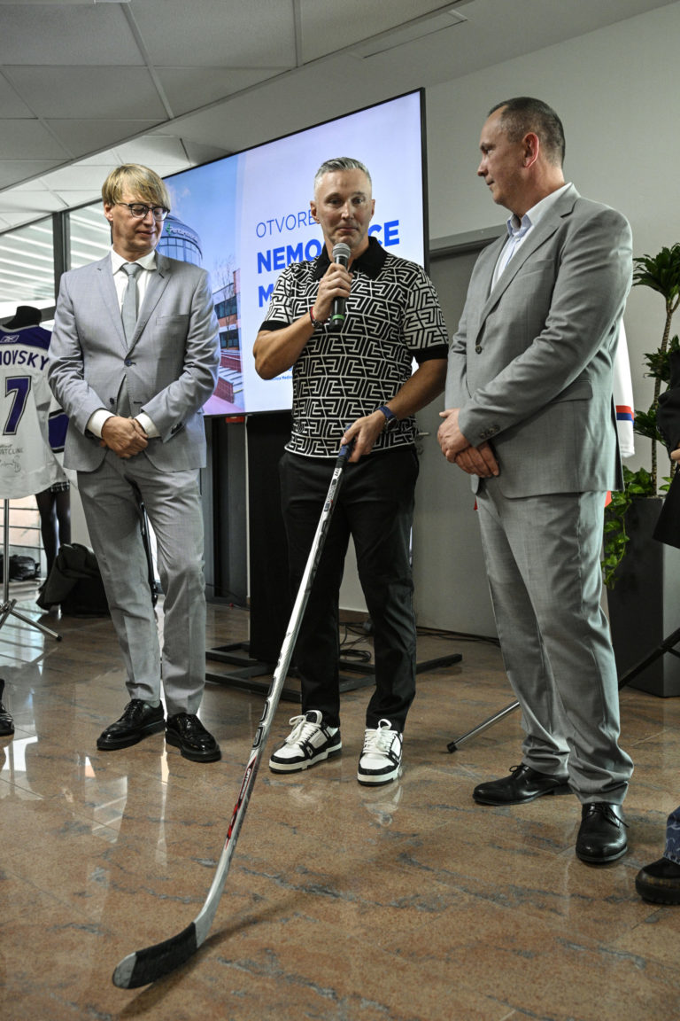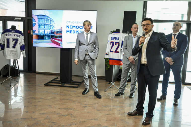 Sprava: Partner Penta Investments Václav Jirků, bývalý hokejový reprezentant, majster sveta a bývalý pacient Sportclinic Ľubomír Višňovský a ortopéd a partner Nemocnice Medissimo Ján Grauzel počas predstavenia nového medicínskeho konceptu Nemocnice Medissimo v bratislavskej Petržalke. Bratislava, 20. február 2024. Foto: SITA/Milan Illík