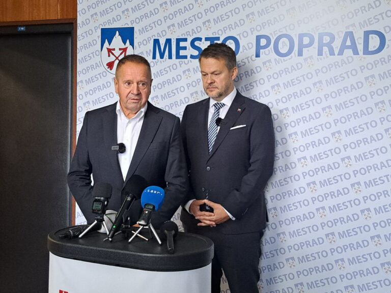 Zľava primátor mesta Poprad Anton Danko a minister investícií, regionálneho rozvoja a informatizácie Samuel Migaľ počas brífingu na Mestskom úrade v Poprade po podpise zmluvy o NFP na rekonštrukciu Námestia sv. Egídia. Foto: SITA/Mária Frisová