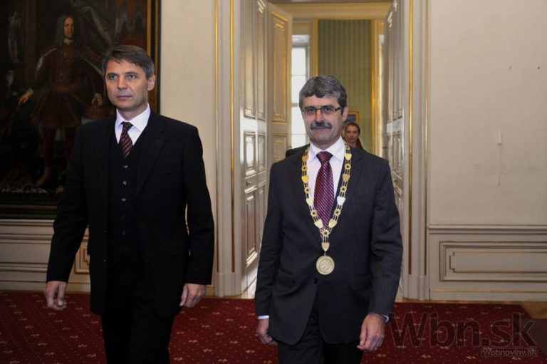 Sprava: Novozvolený bratislavský primátor Ivo Nesrovnal a jeho predchodca Milan Ftáčnik počas ustanovujúceho zasadnutia Mestské zastupiteľstvo hlavného mesta SR Bratislavy. Bratislava, 11. december 2014. Foto: SITA/Ján Slovák