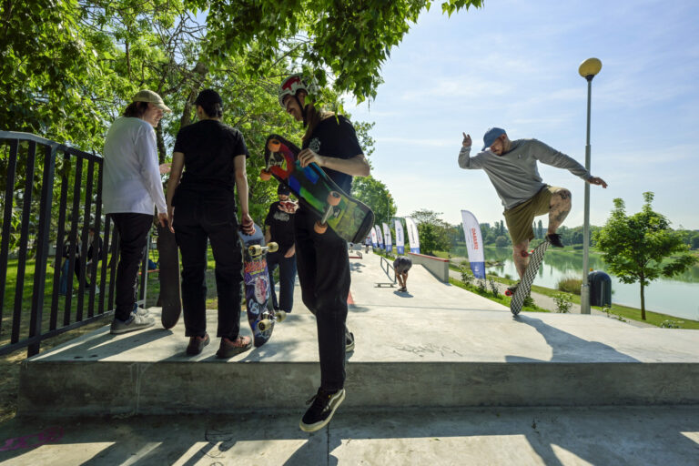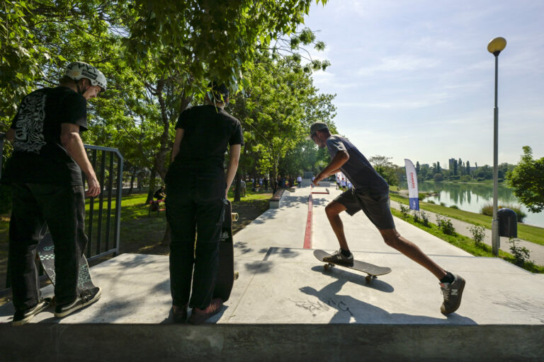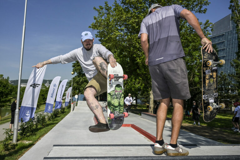 Skatebordisti počas jazdy v novom skateparku pri jazere Kuchajda v bratislavskej mestskej časti Nové Mesto. Bratislava, 30. apríl 2025. Foto: SITA/Milan Illík