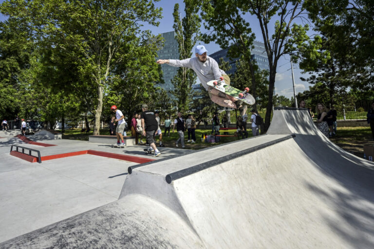 Skatebordisti v novom skateparku pri jazere Kuchajda v bratislavskej mestskej časti Nové Mesto. Bratislava, 30. apríl 2025. Foto: SITA/Milan Illík