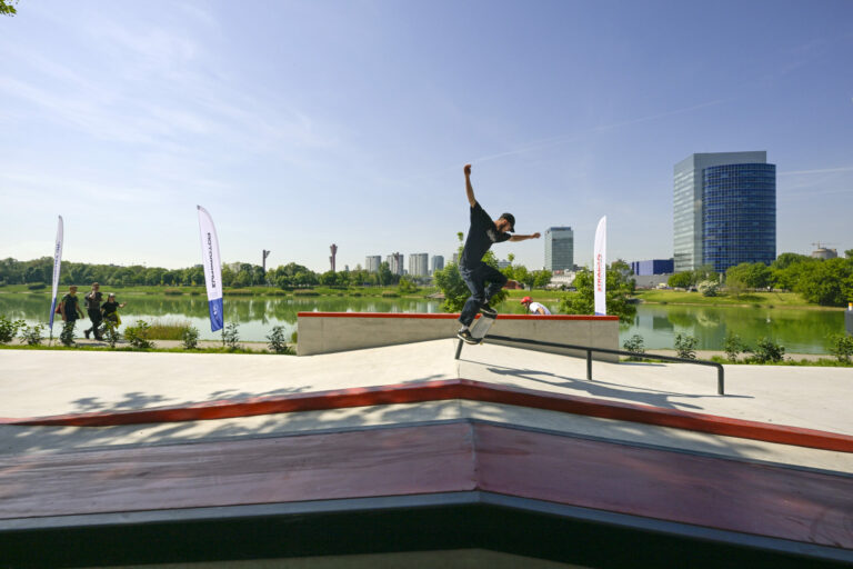 Skatebordista počas jazdy v novom skateparku pri jazere Kuchajda v bratislavskej mestskej časti Nové Mesto. Bratislava, 30. apríl 2025. Foto: SITA/Milan Illík