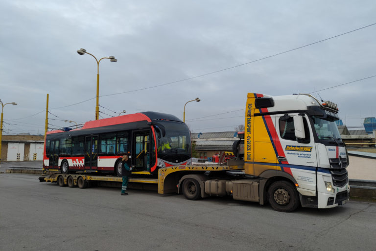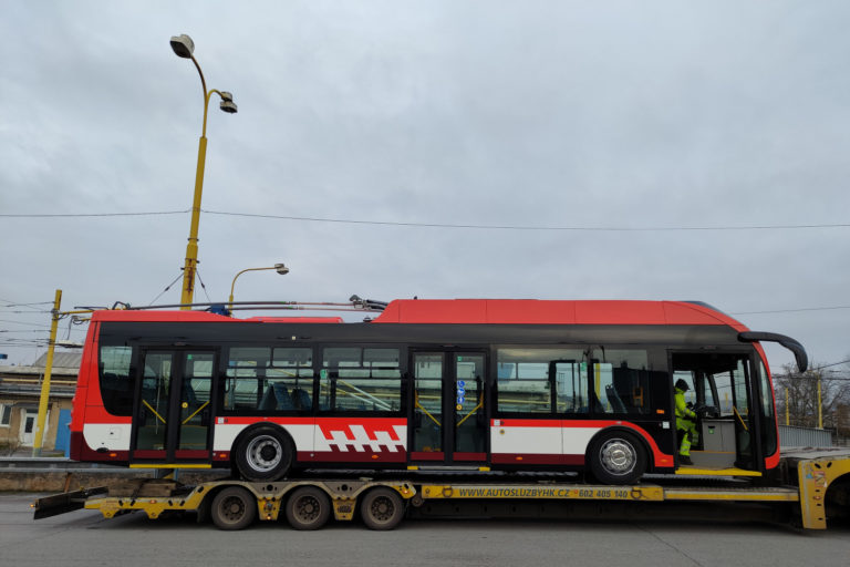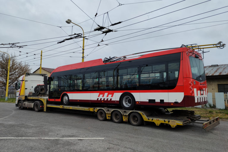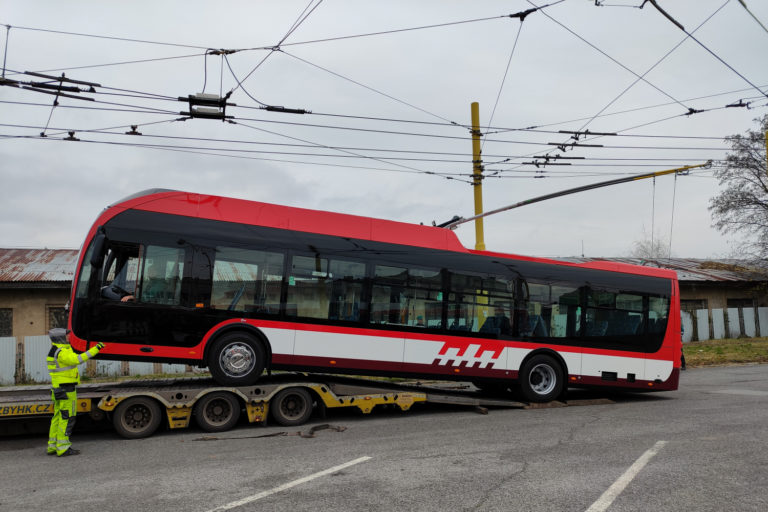 Do areálu Dopravného podniku mesta Prešov dorazil prvý zo štyroch zakúpených parciálnych trolejbusov typu SOR TNS 12. Trolejbusy budú obsluhovať vybrané linky MHD, ktoré v súčasnej dobe obsluhujú štandardné naftové autobusy. Prešov, 23. november 2023. Foto: SITA/Juraj Handzuš/DPMP