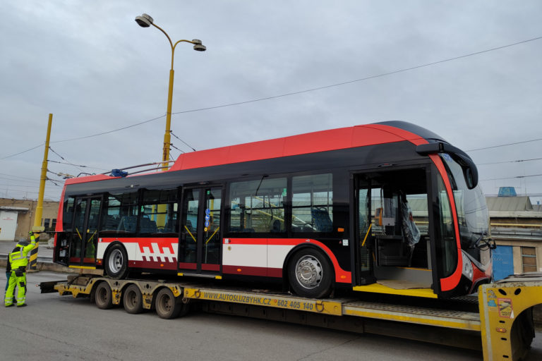 Do areálu Dopravného podniku mesta Prešov dnes dorazil prvý zo štyroch zakúpených parciálnych trolejbusov typu SOR TNS 12. Trolejbusy budú obsluhovať vybrané linky MHD, ktoré v súčasnej dobe obsluhujú štandardné naftové autobusy. Prešov, 23. november 2023. Foto: SITA/Juraj Handzuš/DPMP