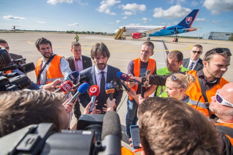 Minister vnútra Robert Kaliňák (v strede) počas brífingu, ktorý sa konal po prílete nového vládneho špeciálu Airbus A319 na Letisko M. R. Štefánika. Bratislava, 14. jún 2016. Foto: SITA/Marko Erd