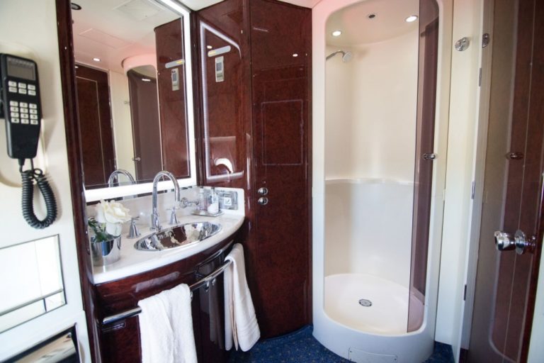 Pohľad do kúpeľne v prezidentskom salóne vo vládnom špeciáli Airbus A319 počas prehliadky lietadla. Bratislava, 14. jún 2016. Foto: SITA/Marko Erd