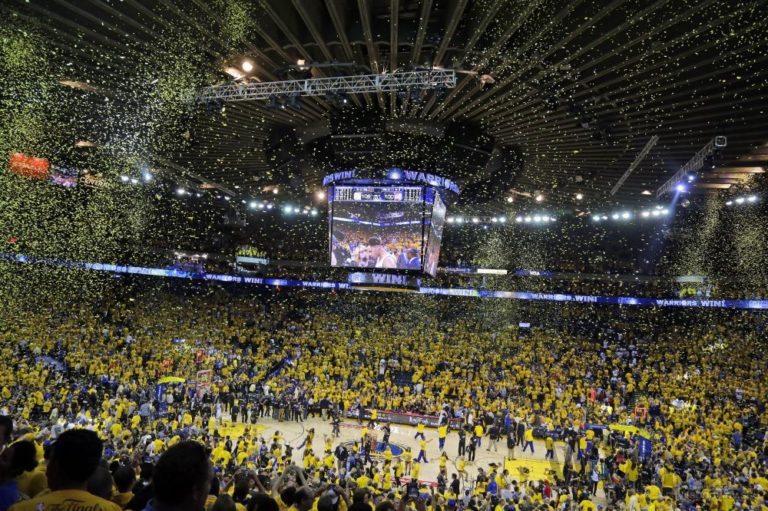 Fanúšikovia Golden State sa tešia z víťazstva ich tímu nad Clevelandom po prvom finálovom zápase NBA, v ktorom Warriors zvíťazili 108:100 po predĺžení. Oakland, 4. jún 2015. Foto: SITA/AP