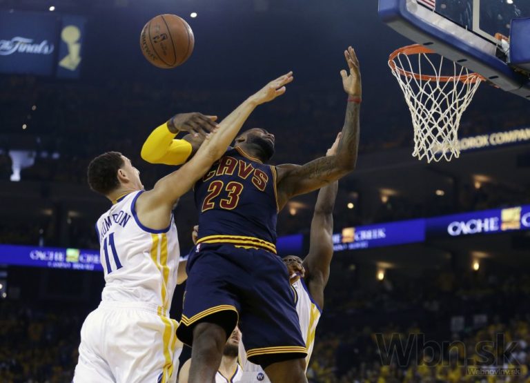 Klay Thompson z Golden State fauluje hviezdu Clevelandu LeBrona Jamesa počas prvého finálového zápasu, v ktorom Warriors zvíťazili 108:100 po predĺžení. Oakland, 4. jún 2015. Foto: SITA/AP