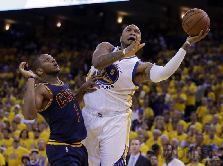 Marreese Speights (5) z Golden State v súboji s Jamesom Jonesom (1) počas prvého finálového zápasu NBA, v ktorom Warriors zvíťazili 108:100 po predĺžení. Oakland, 4. jún 2015. Foto: SITA/AP