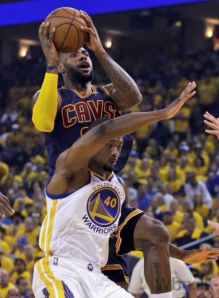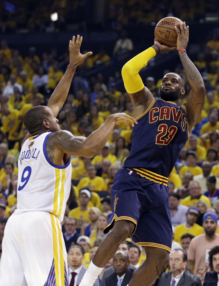 Andre Iguodala (9) z Golden State sa snaží zablokovať strelu hviezdy Clevelandu LeBrona Jamesa počas prvého finálového zápasu NBA, v ktorom Warriors zvíťazili 108:100 po predĺžení. Oakland, 4. jún 2015. Foto: SITA/AP