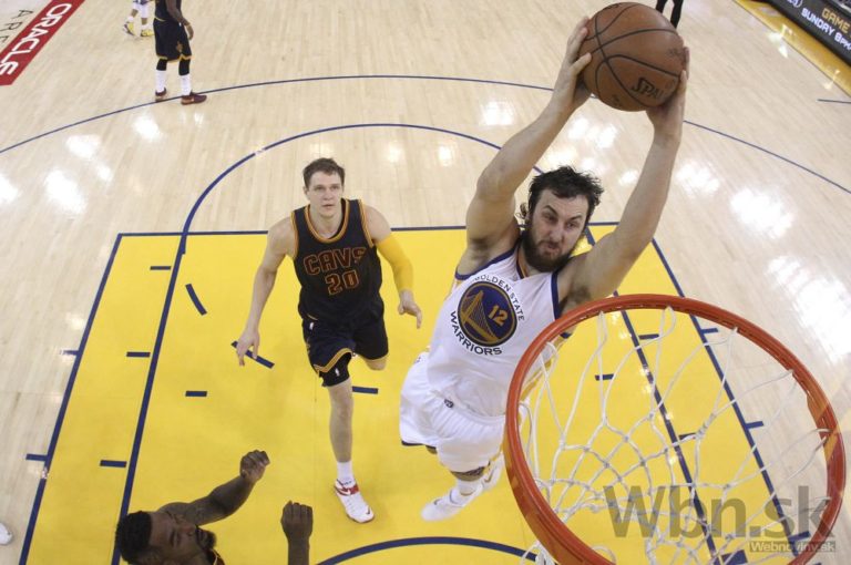Efektná smeč Andrewa Boguta (12) z Golden State počas prvého finálového zápasu NBA, v ktorom Warriors porazili Cleveland 108:100 po predĺžení. Oakland, 4. jún 2015. Foto: SITA/AP