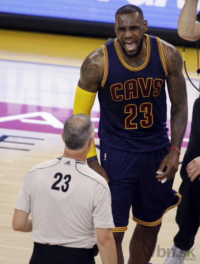 Hviezda Clevelandu LeBron James diskutuje s rozhodcom Jasonom Phillipsom (23) počas prvého finálového zápasu NBA, v ktorom Cavaliers prehrali s Golden State 100:108 po predĺžení. Oakland, 4. jún 2015. Foto: SITA/AP