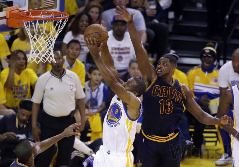 Tristan Thompson (13) z Clevelandu sa snaží zablokovať zakončujúceho Andrea Iguodalu (9) z Golden State počas prvého finálového zápasu NBA, v ktorom Warriors zvíťazili 108:100 po predĺžení. Oakland, 4. jún 2015. Foto: SITA/AP