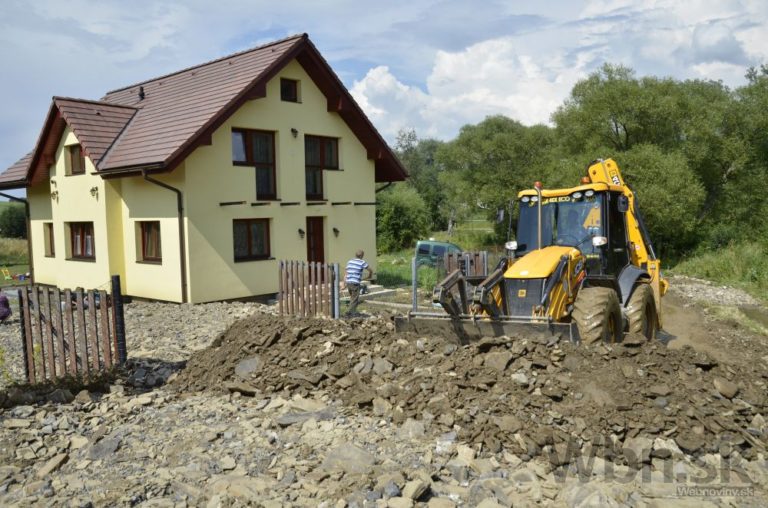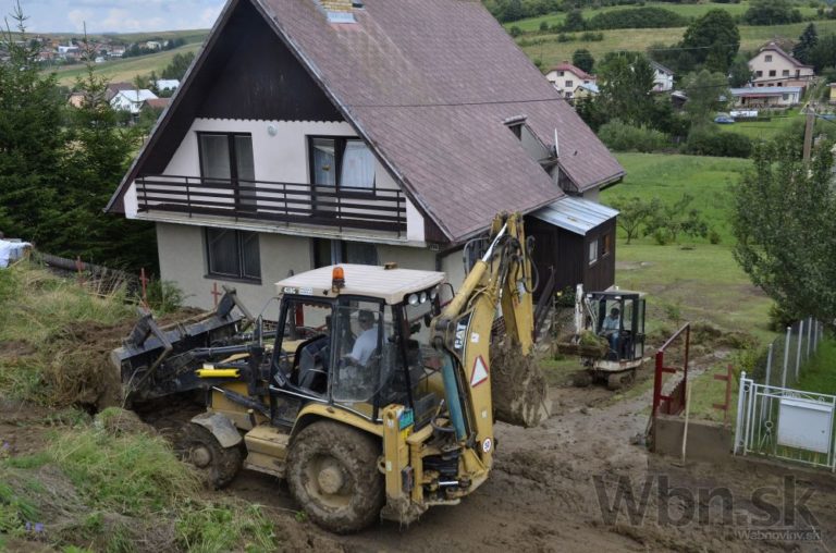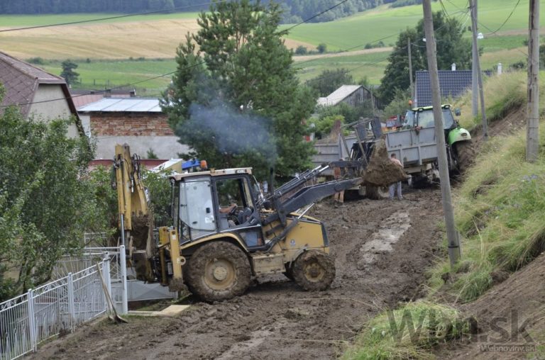 Práce na odpratávaní zosunutého svahu. Prívalová vlna sa v piatok večer prehnala obcou Vlková. V obci vyhlásili tretí stupeň povodňovej aktivity. Vlková, 26.júl 2014. Foto: SITA/Radoslav Maťaš