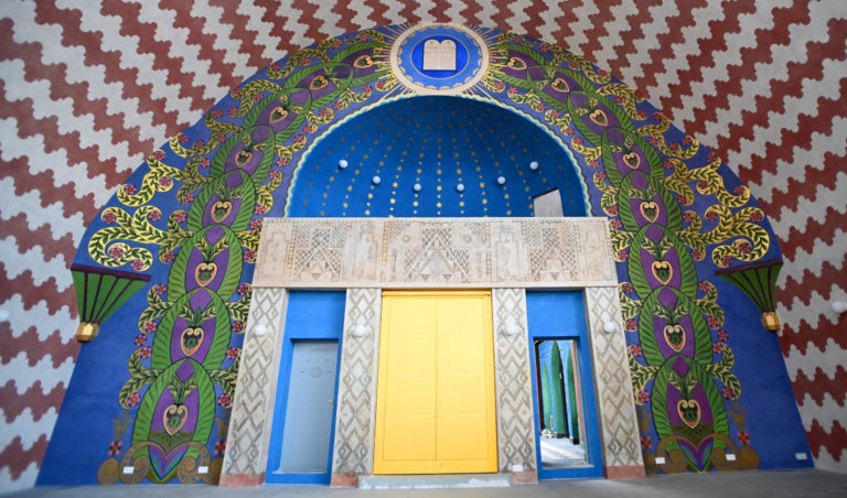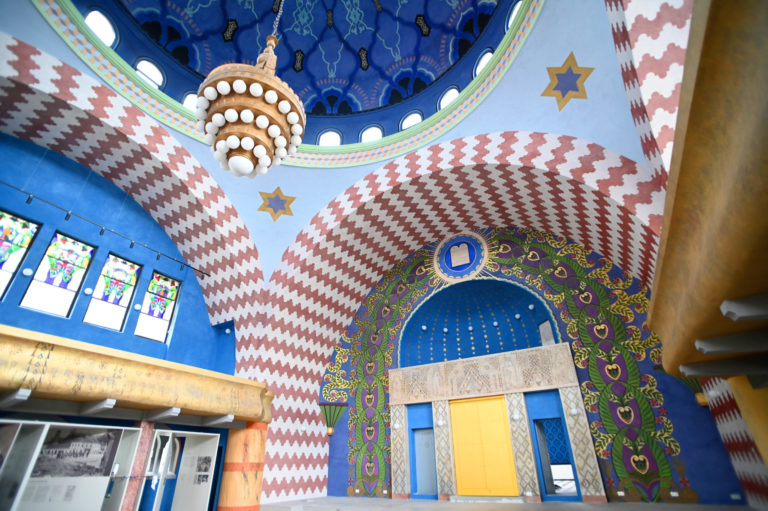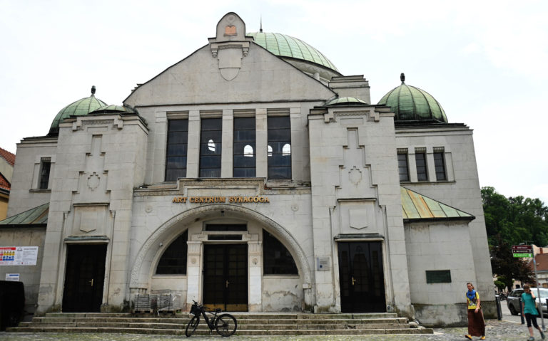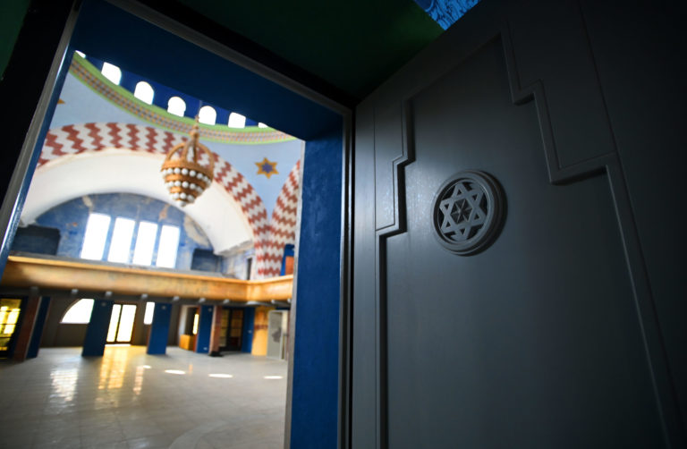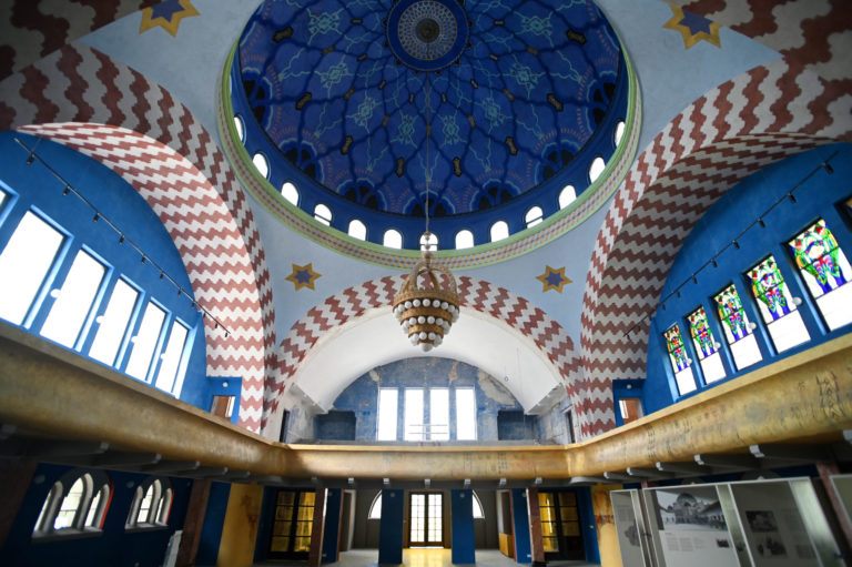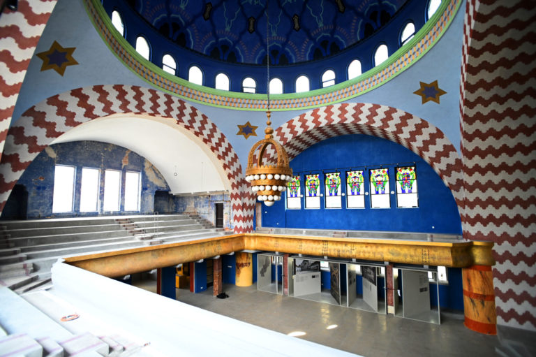 Budova Národnej kultúrnej pamiatky trenčianskej synagógy po niekoľkomesačných rekonštrukčných prácach na výmaľbe, novej podlahe, dverách, oknách a vyriešení zlej akustiky. Práce na kompletnej rekonštrukcii by mali byť hotové do roku 2026, kedy sa mesto Trenčín stane európskym hlavným mestom kultúry. Trenčín, 18. apríl 2024. Foto: SITA/Tomáš Somr.