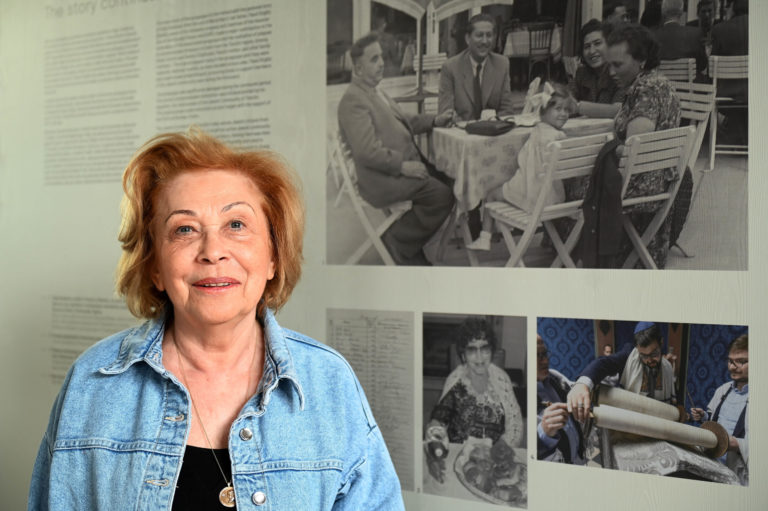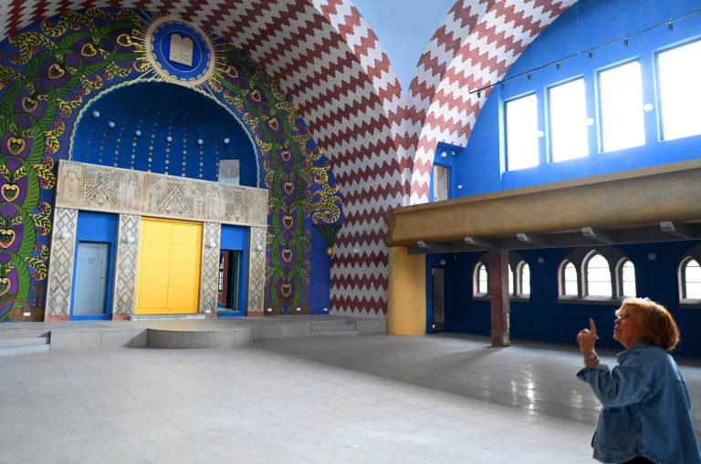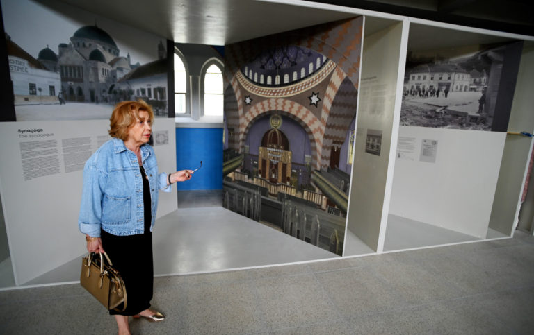 Predsedníčka Židovskej náboženskej obce Trenčín Oľga Hodálová počas výkladu o trenčianskej synagóge po niekoľkomesačných rekonštrukčných prácach na výmaľbe, novej podlahe, dverách, oknách a vyriešení zlej akustiky dočkala nového interiéru. Práce na kompletnej rekonštrukcii by mali byť hotové do roku 2026, kedy sa mesto Trenčín stane európskym hlavným mestom kultúry. Trenčín, 18. apríl 2024. Foto: SITA/Tomáš Somr.