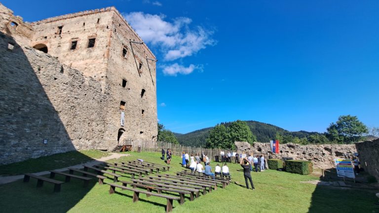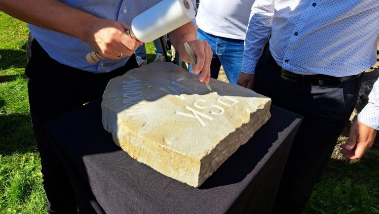 Symbolické poklepanie kameňa v rámci rekonštrukcie časti hradu Ľubovňa pri odovzdaní staveniska zhotoviteľovi. Stará Ľubovňa, 5. september 2023. Foto: SITA/Mária Frisová