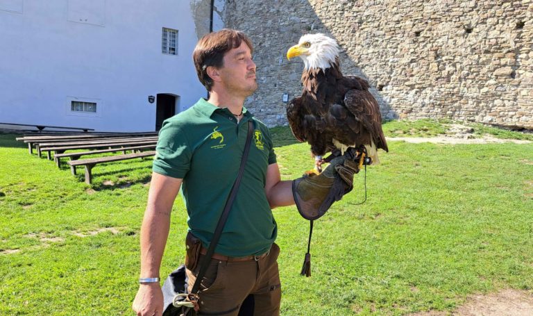 Sokoliar Pavol Michal na nádvorí Ľubovnianskeho hradu. Stará Ľubovňa, 5. september 2023. Foto: SITA/Mária Frisová