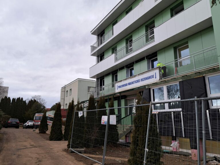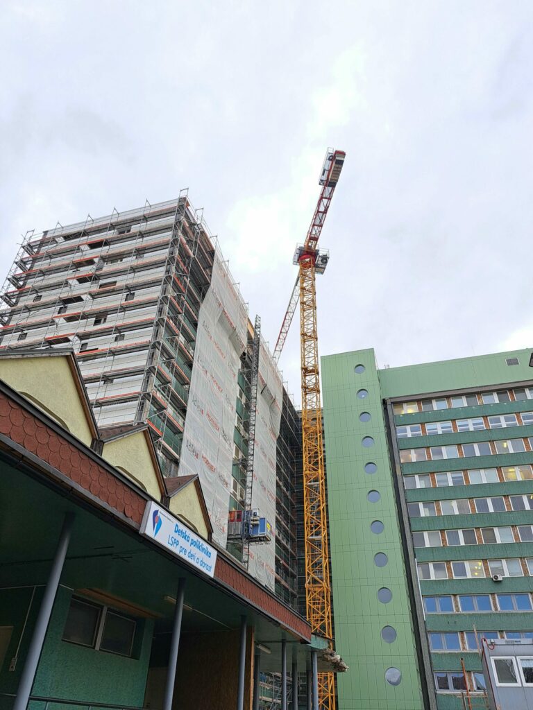 Pohľad na priečelie popradskej nemocnice počas stavebných prác v rámci projektu Komplexná obnova a prestavba Nemocnice Poprad. Poprad, 28. január 2025. Foto: SITA/Mária Frisová.