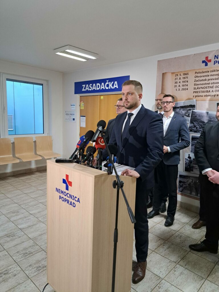 Minister zdravotníctva Kamil Šaško (v popredí) počas tlačovej konferencie k stavu rekonštrukcie popradskej nemocnice necelý rok od spustenia projektu Komplexná obnova a prestavba Nemocnice Poprad, na ktorý získala 40 miliónov eur z Plánu obnovy a odolnosti. Poprad, 28. január 2025. Foto: SITA/Mária Frisová.
