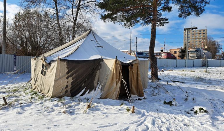 Vyhrievaný vojenský stan vedľa budovy nocľahárne v areáli sociálnych služieb na Levočskej ulici v Poprade, ktorý v minulosti, najmä počas zimy, poskytoval ďalšie ubytovacie kapacity. Poprad, 29. november 2023. Foto: SITA/Mária Frisová