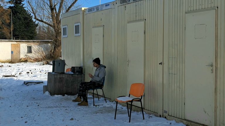 Jeden z klientov nocľahárne pre ľudí bez domova na Levočskej ulici v Poprade pri obytných kontajneroch, ktoré boli využívané počas rekonštrukcie zariadenia. Poprad, 29. november 2023. Foto: SITA/Mária Frisová