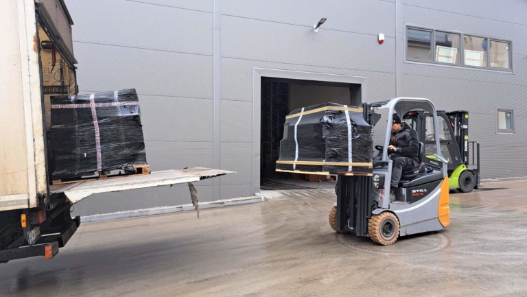 Nakladanie tovaru výrobcu liehovín, spoločnosti Karloff v Kežmarku, v areáli bývalej fabriky na spracovanie ľanu, národnej kultúrnej pamiatky, známej ako Pradiareň. Kežmarok, 23. február 2024. Foto: SITA/Mária Frisová
