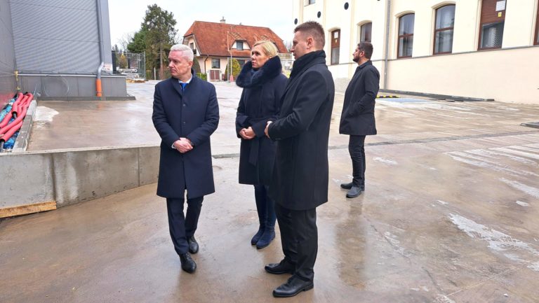 Zľava: Primátor Kežmarku Ján Ferenčák, ministerka hospodárstva Denisa Saková a riaditeľ spoločnosti Karloff Erik Semaňák počas prehliadky areálu výrobcu liehovín vrátane zrekonštruovanej budovy bývalej fabriky na spracovanie ľanu, národnej kultúrnej pamiatky, známej ako Pradiareň. Kežmarok, 23. február 2024. Foto: SITA/Mária Frisová