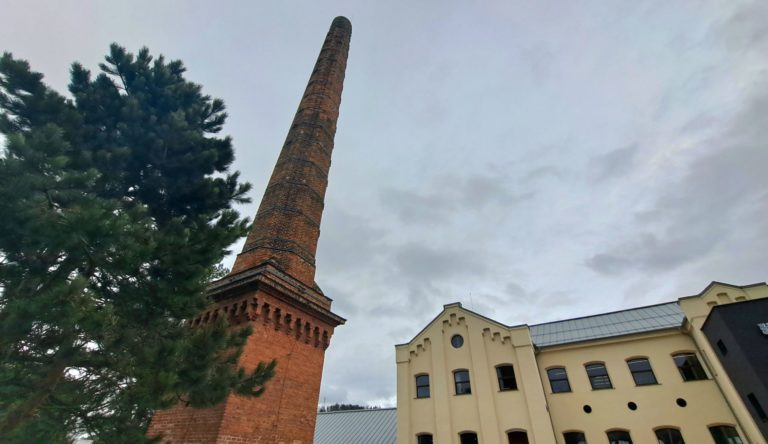 Zachovaný komín a zrekonštruovaná budova areálu bývalej fabriky na spracovanie ľanu v Kežmarku, národnej kultúrnej pamiatky, známej ako Pradiareň, ktorej priestory patria výrobcovi liehovín, spoločnosti Karloff. Kežmarok, 23. február 2024. Foto: SITA/Mária Frisová