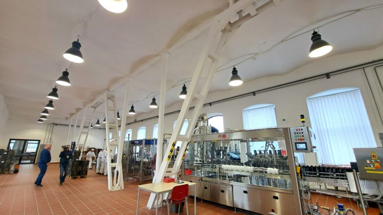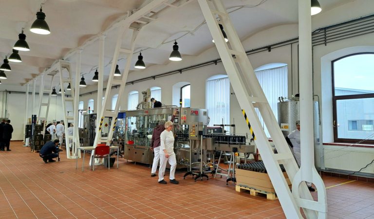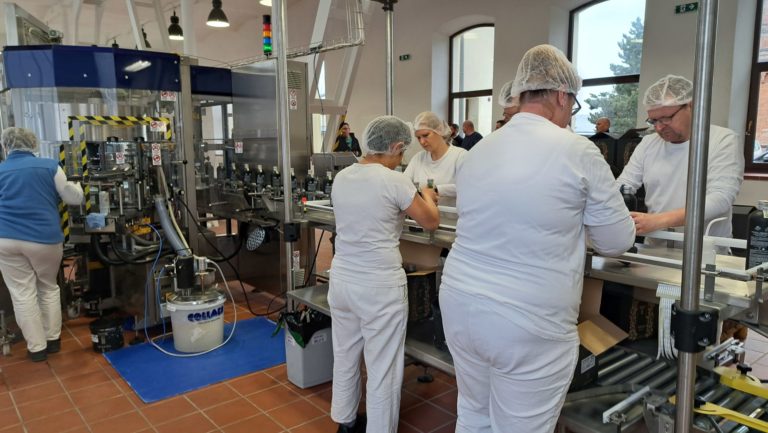 Zamestnanci výrobcu liehovín, spoločnosti Karloff, pri balení výrobkov v zrekonštruovanej budove bývalej fabriky na spracovanie ľanu v Kežmarku, národnej kultúrnej pamiatky, známej ako Pradiareň. Kežmarok, 23. február 2024. Foto: SITA/Mária Frisová
