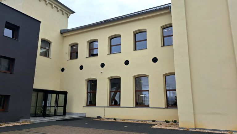 Zrekonštruovaná fasáda hlavnej budovy areálu bývalej fabriky na spracovanie ľanu v Kežmarku, národnej kultúrnej pamiatky, známej ako Pradiareň, ktorej priestory patria výrobcovi liehovín, spoločnosti Karloff. Kežmarok, 23. február 2024. Foto: SITA/Mária Frisová