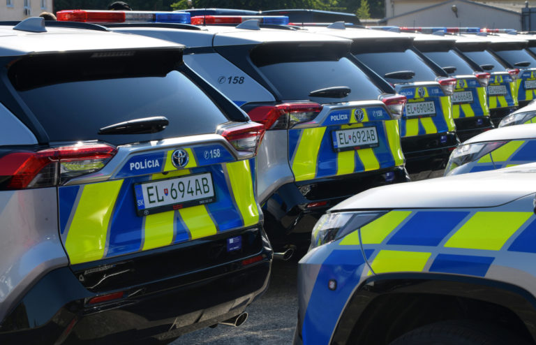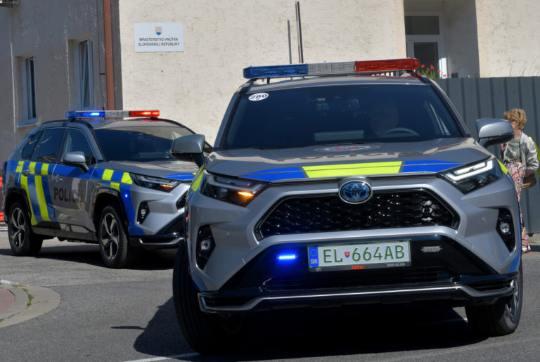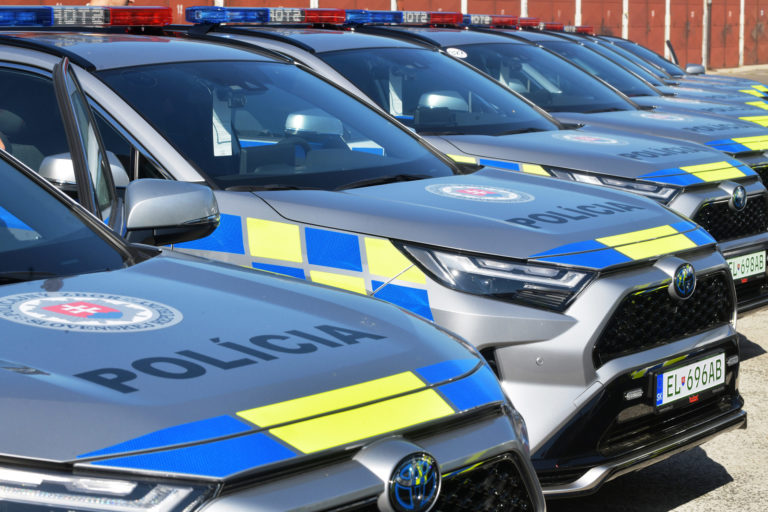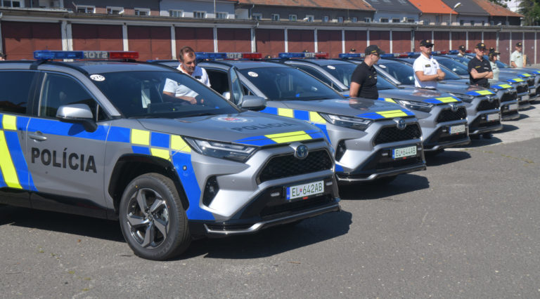 Nové vozidlá kategórie SUV Toyota RAV4 Plug - In Hybrid, 2,5 Plug in hybrid v policajnej verzii s novými EČV, ktoré Ministerstvo vnútra SR prerozdelilo na krajské a okresné riaditeľstvá Policajného zboru v rámci krajov Trnava, Nitra, Banská Bystrica, Žilina, Trenčín a Košice. Vozidlá sú zakúpené zo zdrojov Plánu obnovy a odolnosti SR. Bratislava, 11. august 2023. Foto: SITA/Ministerstvo vnútra SR/Vladimír Benko