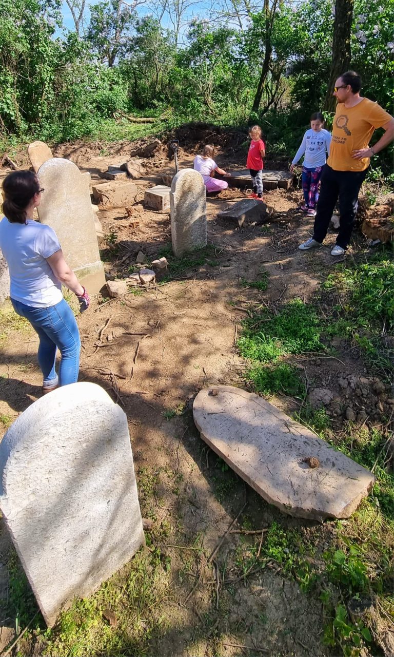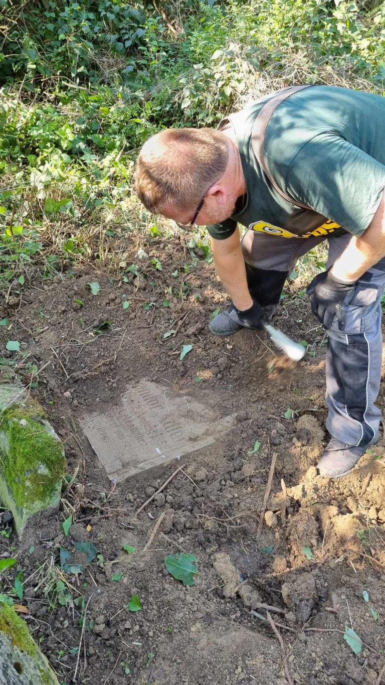 Dobrovoľníci z občianskeho združenia Fontis počas obnovy náhrobných kameňov na židovskom cintoríne v obci Michal nad Žitavou v okrese Nové Zámky. Michal nad Žitavou, 15. apríl 2024. Foto: SITA/OZ Fontis