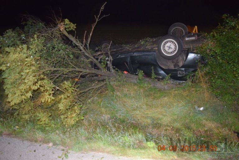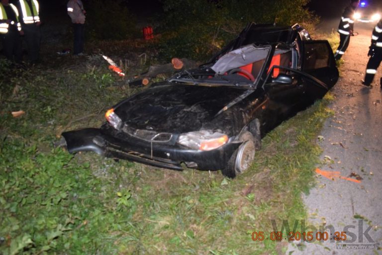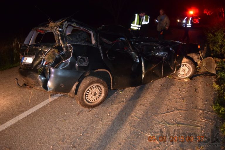 Tragická nehoda sa stala na ceste medzi závodom Kovostroj Dobšiná a Vyšnou Slanou. 37-ročný vodič Daewoo Nubira prešiel na rovnej ceste do protismeru, dostal šmyk a narazil do svahu odtokovej priekopy a vzápätí do stromov. Jeden strom vytrhol a ďalší zvalil. Auto po náraze zostalo na streche. Foto: SITA/KRPZ Košice